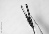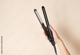 Hair care. Female hand holding hair straightener on a beige background. Top view