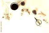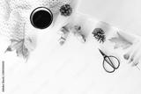 Autumn, fall workspace composition with closed laptop. Cup of coffee, wool blanket, autumn leaves, dry eucalyptus, scissors and pine cones on white table background. Flat lay, top view. Blogger design