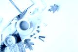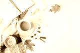 Autumn workspace still life, fall feminine scene. Notebook mock-up scene with cup of coffee, candle, cinnamon sticks, wool blanket, oak leaves and acorns. White table background. Flat lay, top view.