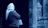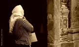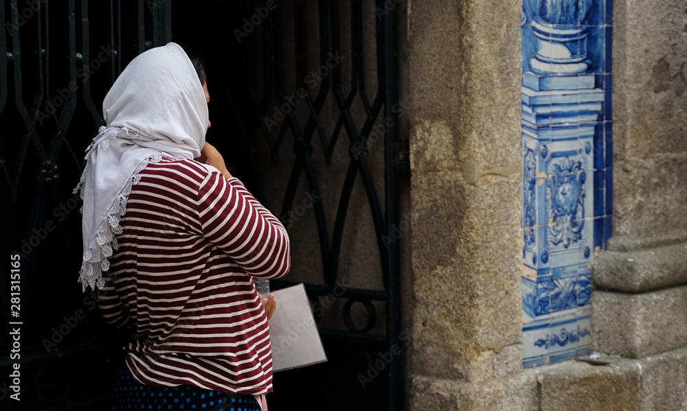 Homeless beggar woman standing outdoors near the church in Porto and asking for money, help, donation.