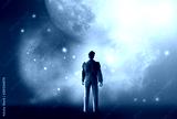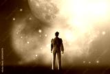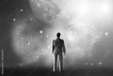 man stands watching with wonder the universe and amazement galaxy fill the night sky 3d render