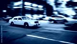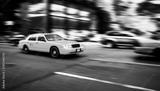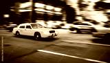 Yellow cab taxi traditional of New York City in fast movement with motion blur panning, in the busy streets of Manhattan, accelerating traffic moves during evening.