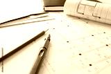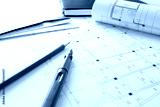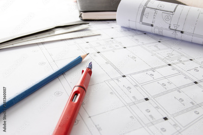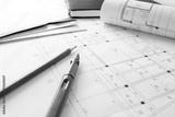 Rolls of architecture blueprints and house plans on the table and architect drawing tools.
