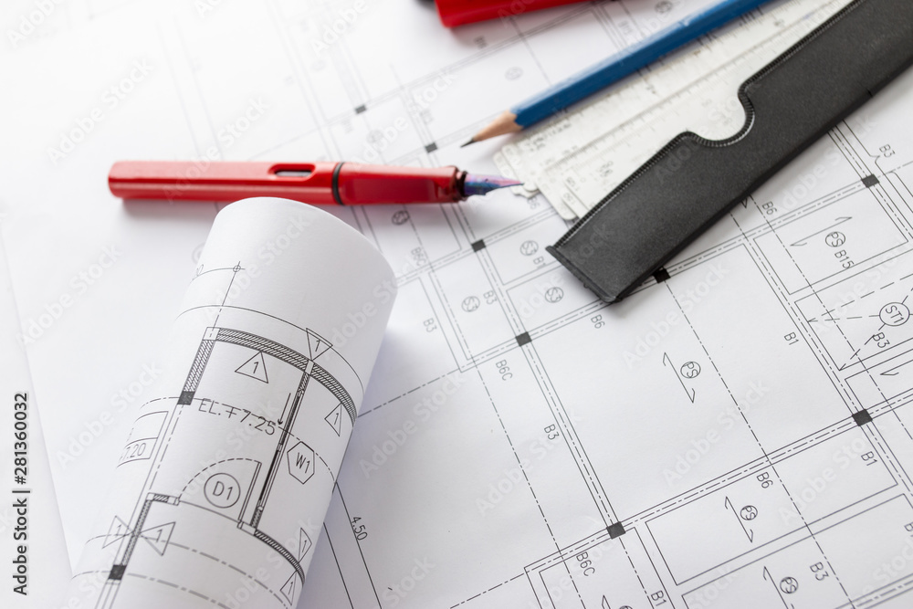 Rolls of architecture blueprints and house plans on the table and architect drawing tools.