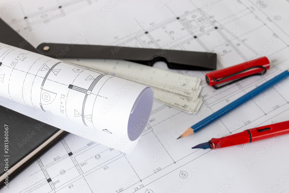 Rolls of architecture blueprints and house plans on the table and architect drawing tools.