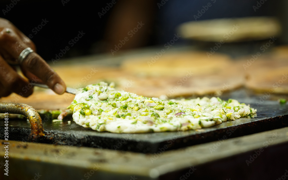 Preparing masala uthappam in a street shop from Bangalore food street, Bengaluru, Karnataka.