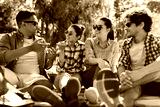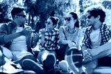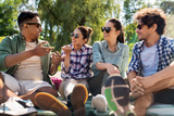 leisure, picnic and people concept - friends hanging out and talking outdoors in summer park