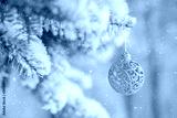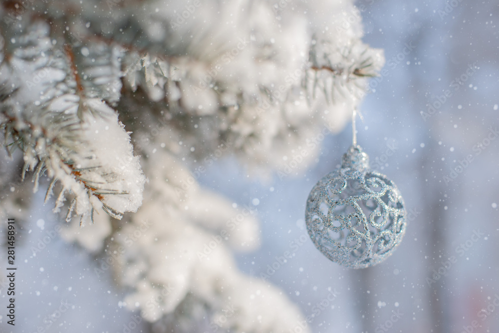 Winter nature Christmas background with frozen spruce, glitter, bokeh, snow.