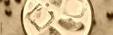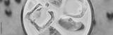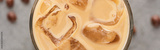 close up view of ice coffee in glass with straw and coffee grains on grey background, panoramic shot