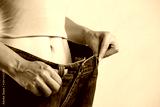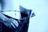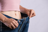 Young slim woman in oversized blue jeans. Fit woman wearing too large pants. Healthcare and woman diet lifestyle concept to reduce belly and shape up healthy stomach muscle.