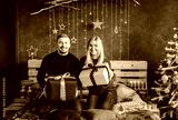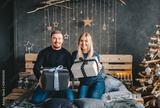 Young family with Christmas gifts together. Christmas holiday. Happy couple sitting on bed.