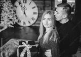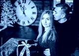 Portrait of happy woman and man with gift box on bed resting together at home.