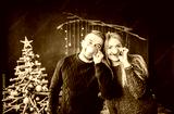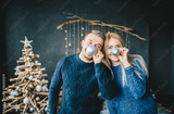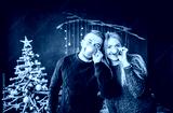 Portrait of two positive playful people having fun in living room with Christmas decor.