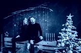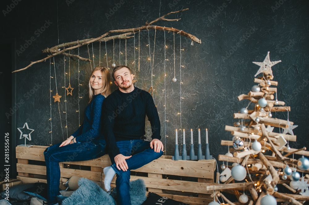 Young couple near Christmas fir-tree in room with wall decorated for christmas.