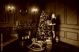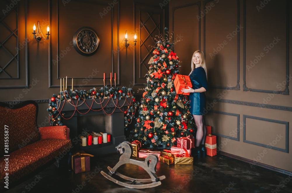 Portrait of blond woman with gift standing in dark living room near holiday Christmas tree.