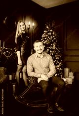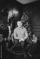 Handsome man on wooden horse swing near christmas decorated tree with her girl