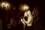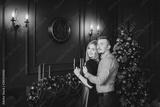 Horizontal portrait of beautiful young couple in New Year's decorations in studio.