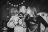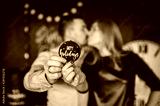Kissing couple holding a wooden round sign "happy holidays". couple holding a wooden round sign "happy holidays".