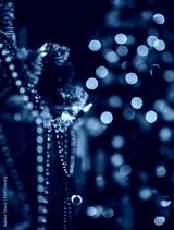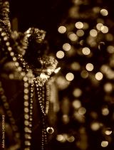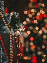 Branch of fir-tree decorated with garland on a blurred colorful background.