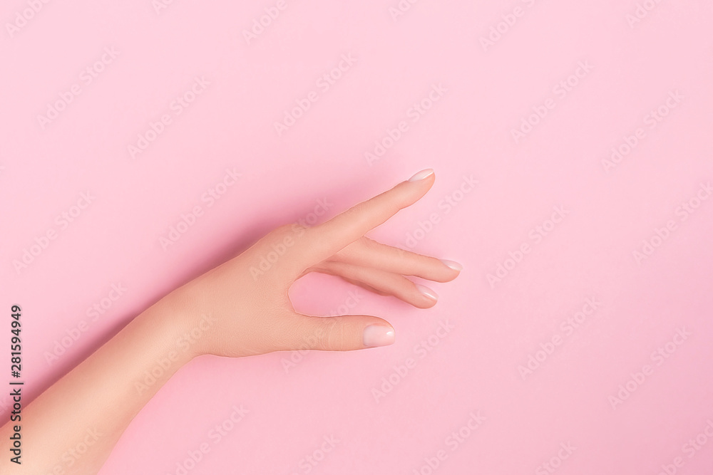 Gentle perfect nude manicure. Female hand on a pastel pink background. Space for text.