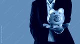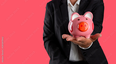 Financial planning concept, Business person holding piggy bank in hand isolated on magenta pink.