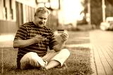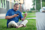 Man finds eommerce offers to buy online with phone and credit card on the city lawn