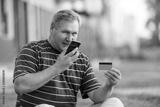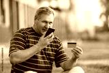Man finds eommerce offers to buy online with phone and credit card on the city lawn