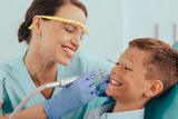 laughing little boy getting teeth treatment in dental clinic