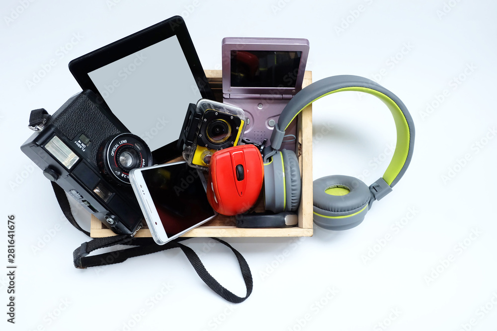 Many used modern Electronic gadgets for daily use in wooden cases on white background, Reuse and Recycle concept