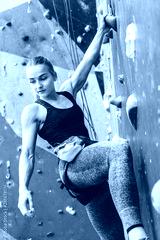 Sportswoman climber moving up on steep rock, climbing on artificial wall indoors. Extreme sports and bouldering concept