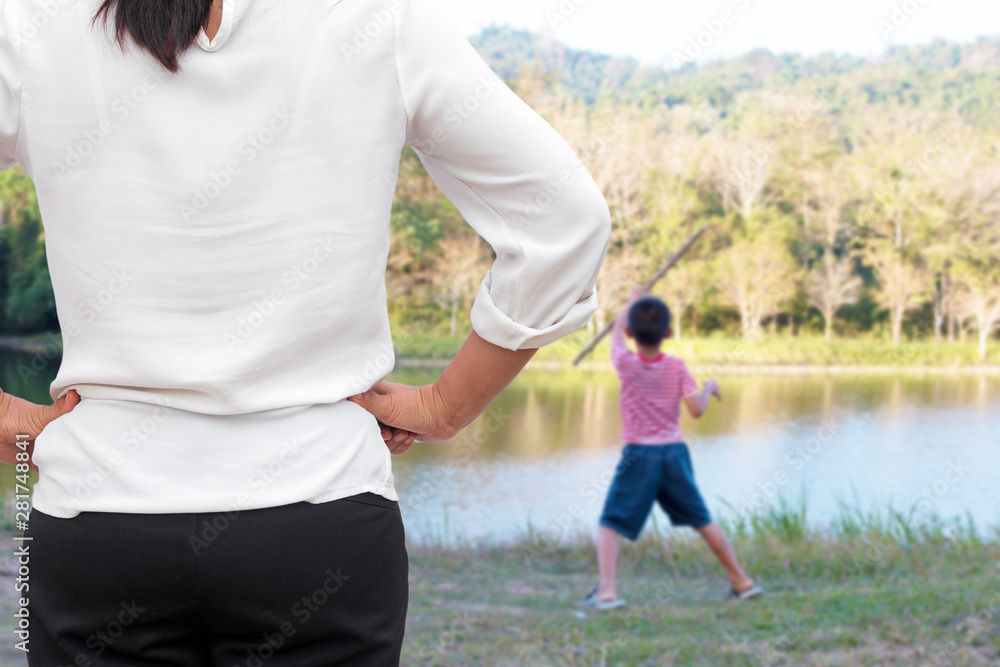 Mother scolds her child because of playing naughty and refusing to obey