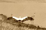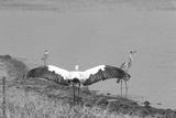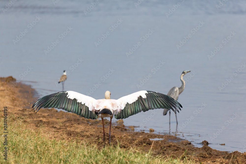 A big bird marabou has spread its wings to dry