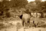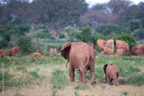 A large family of red elephants on their way through the Kenyan savanna