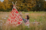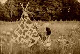 hipster woman in the form of a Shaman is looking for inspiration from mother Earth in a wigwam in nature.