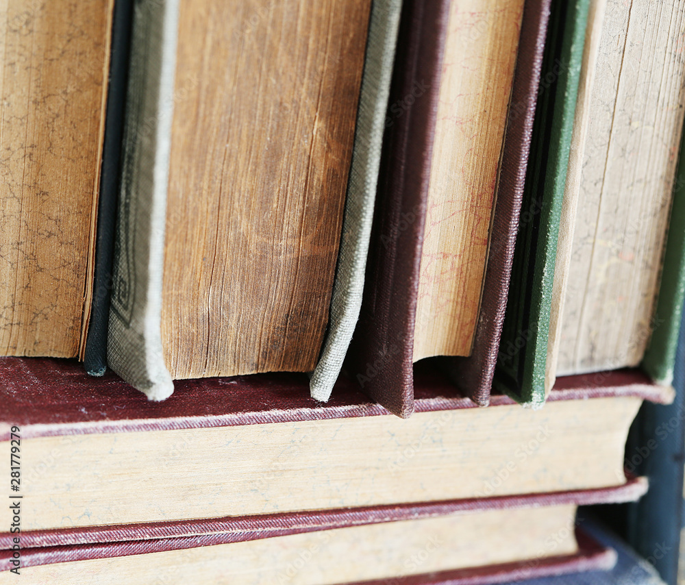 old books on wooden shelf.