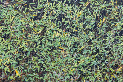 Potamogeton. Espiga, pasto, hierba, lila de agua. Humedal con hojas y tallos flotantes.