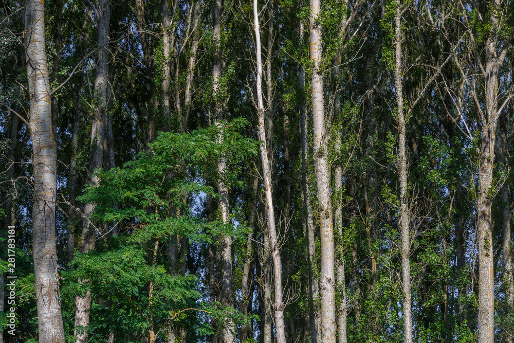 Bosque de grandes y elevados Chopos y Falsas Acacias. Robinia pseudoacacia y Populus. San Esteban de Nogales, León.