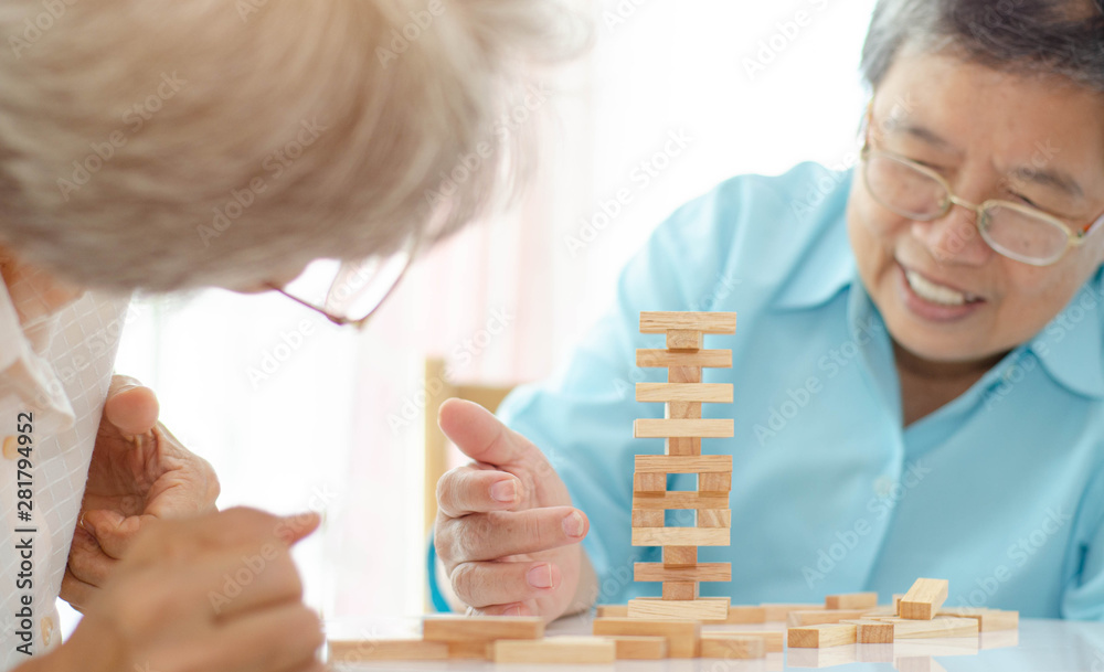 Asian elderly women Wearing a blue shirt And friend are playing games Have fun in the morning at home in the room.