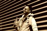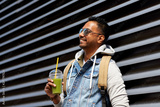 travel, tourism and lifestyle concept - smiling indian man with backpack drinking smoothie from plastic cup with straw on city street