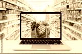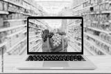 supermarket aisle blurred background with laptop computer and green shopping bag on wood table grocery online concept