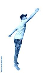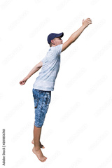 Side view full length portrait of a casual young man wearing a hat hand stretched trying to reach to something isolated over white background.