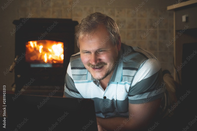 Single man watching online content on a laptop at night on the floor of the room by the fireplace
