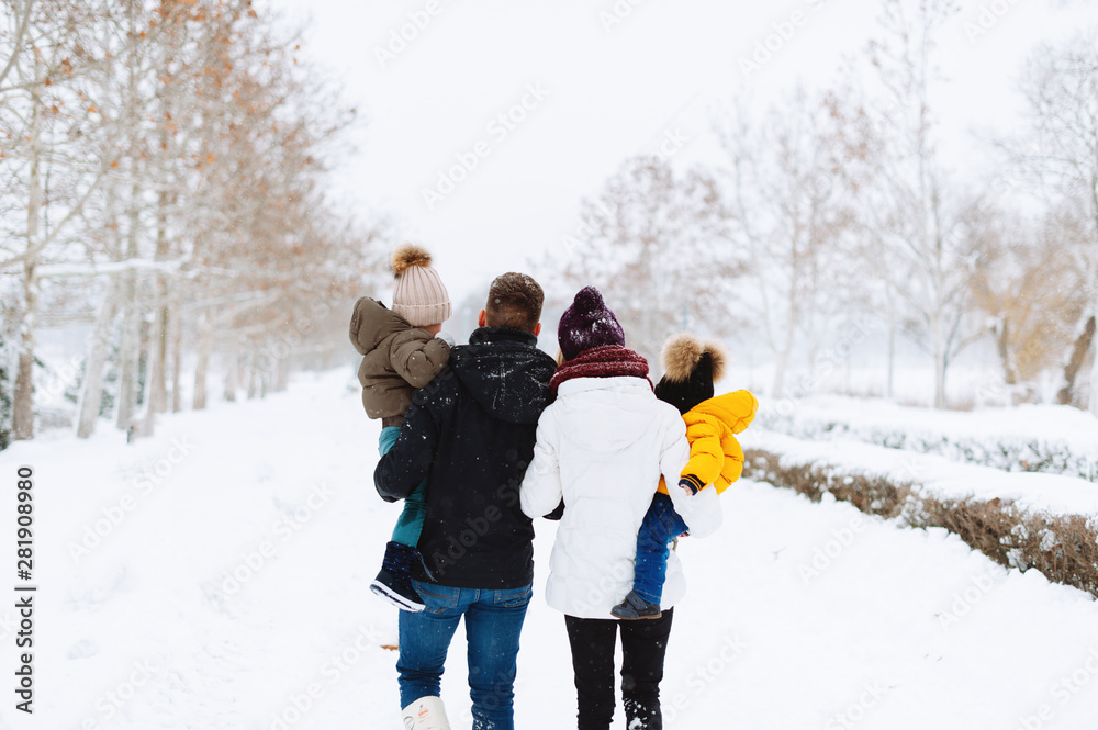 Photo from back of a family having time together, a winter walk