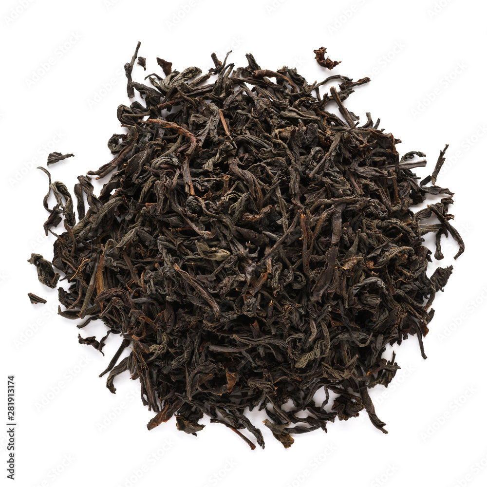 Dry black tea leaves isolated on white background.