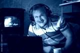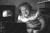 Man watching interesting online content on a laptop using headphones at night in the living room by the fireplace