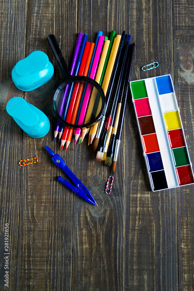 School accessories. Paints, pencils, brushes, pair of compasses, magnifying glass on a dark wooden background with copy space. Flat lay