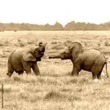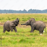 Two young elephants playing together in Africa, cute animals in the Amboseli park in Kenya