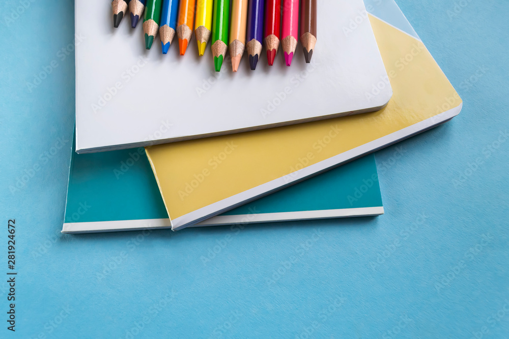 Set of exercise books and colored pencils on a green background with space for text. School accessories. Flat lay
