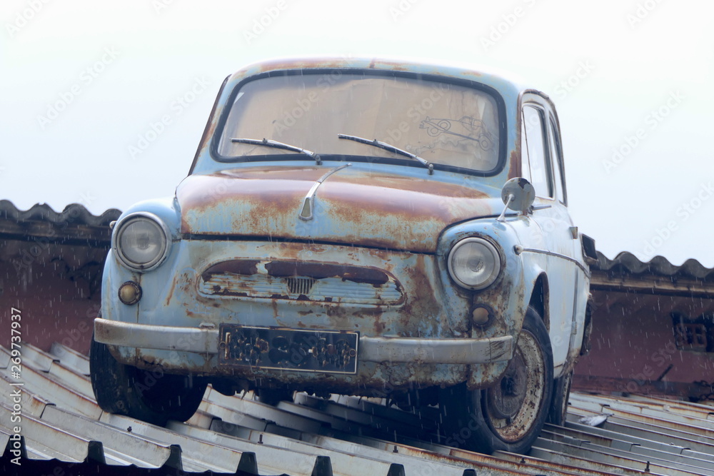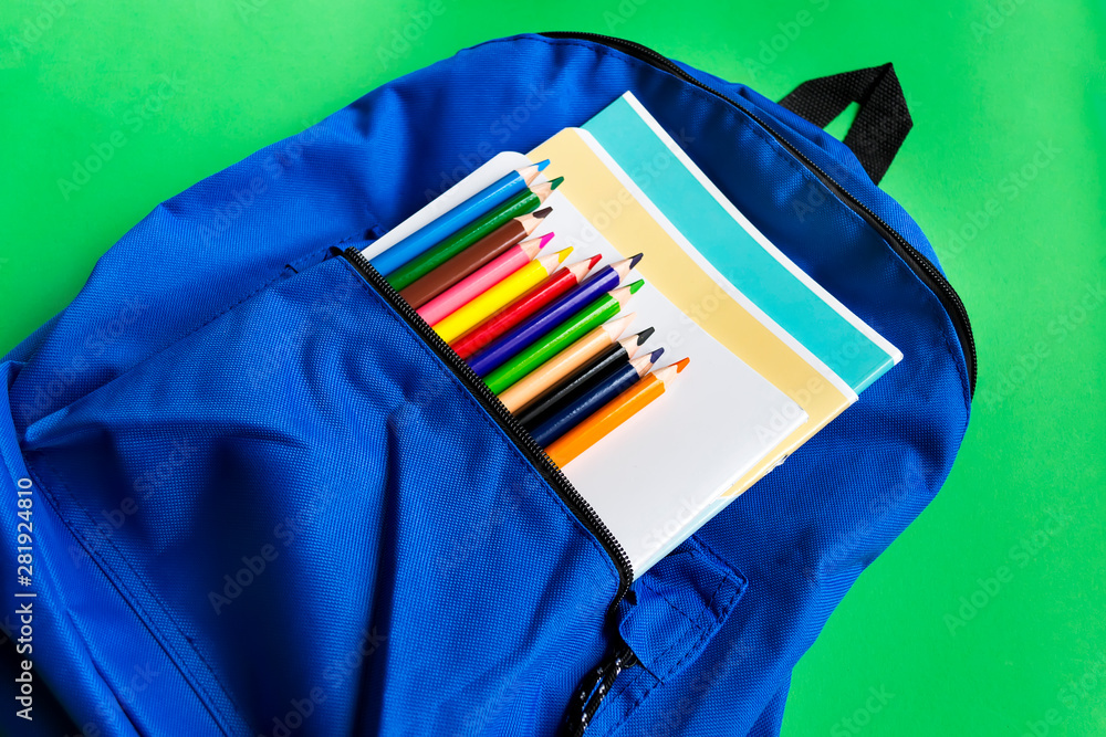Notebooks and multi-colored pencils in a backpack on a paper green background. School accessories. Top view