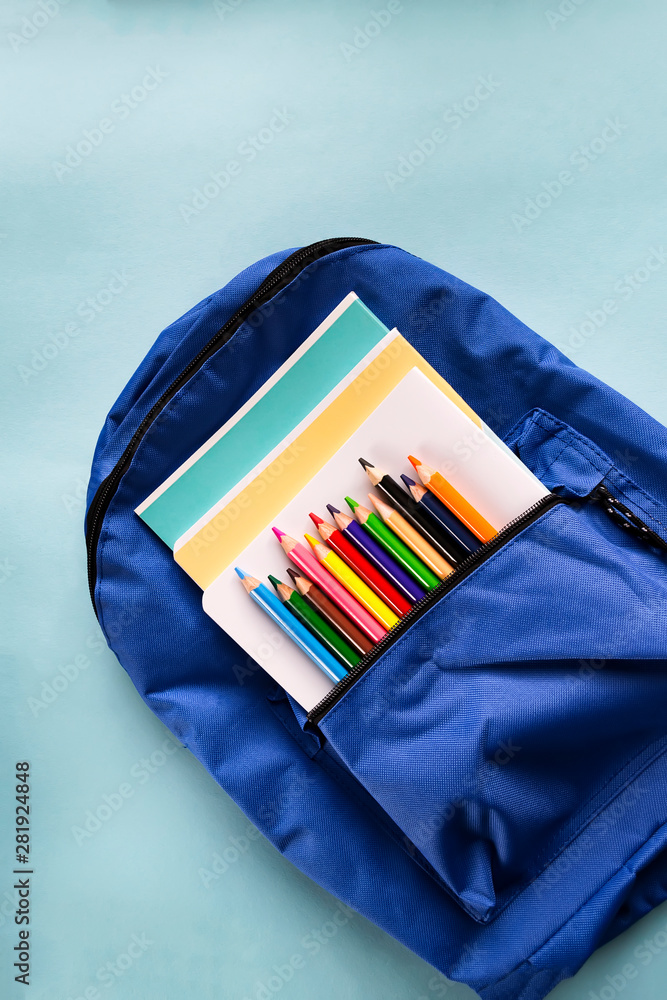 School backpack with notebooks and pencils on a paper blue background with copy space. School Supplies. Top view